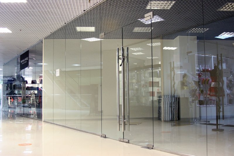 В отличие от радиусных перегородок, в прямых стеклянных перегородках возможна разбивка на большие сегменты.